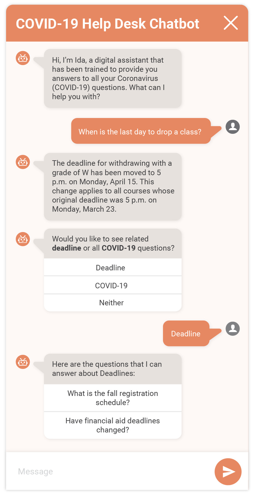 At IntraSee we have been working with our digital assistant, IDA, to create a configurable COVID-19 chatbot that can respond to the typical questions in the higher education world that are unique to your institution (not stuff that’s already all over the internet). Note: very soon we will roll out another COVID-19 chatbot for the commercial and public sectors.