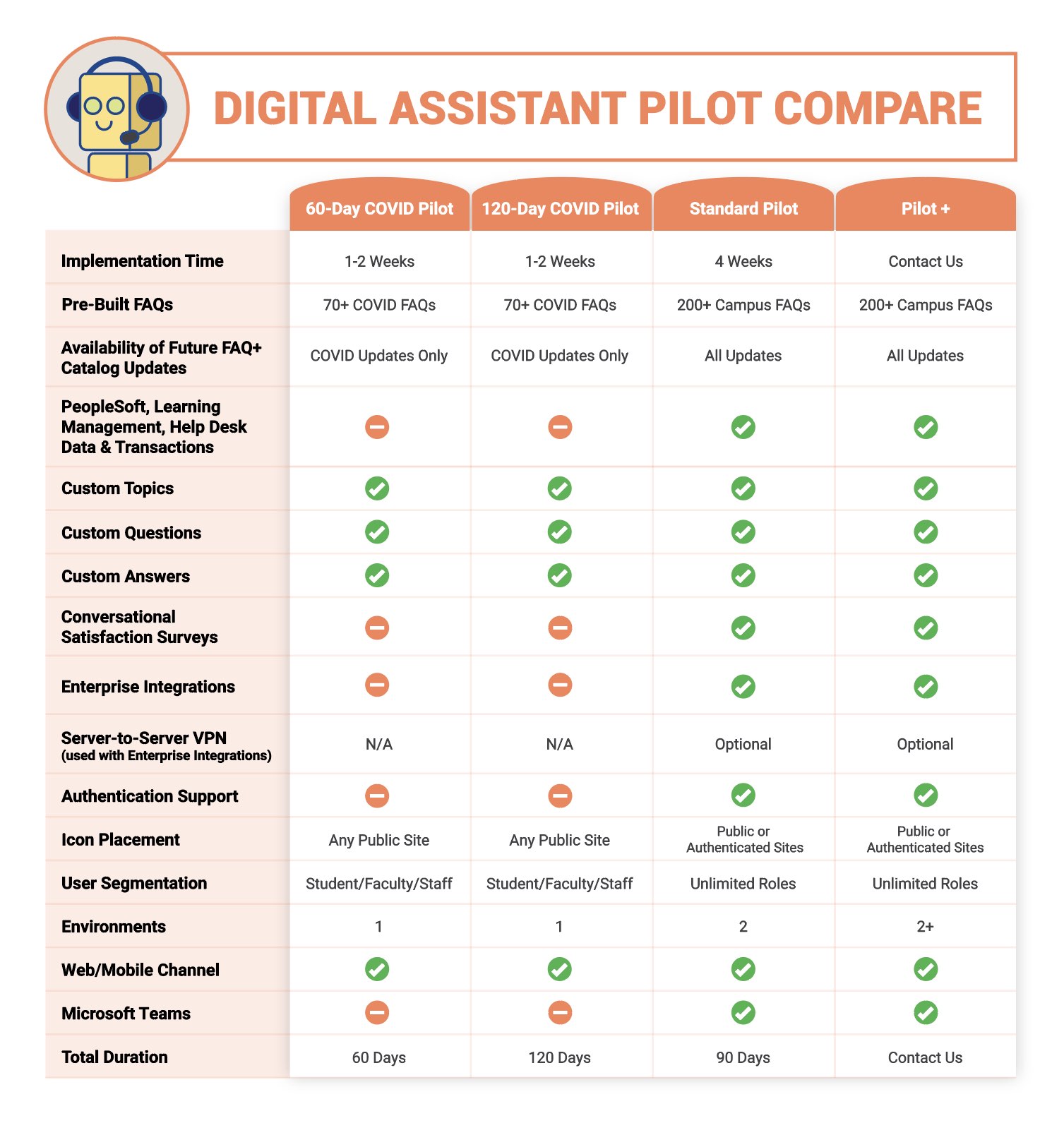 All of our digital assistant solutions are implemented by starting with a pilot program. The following table summarizes the various implementation options for all of our pilots. And you can always start with our COVID-19 bot and transition over to a full campus digital assistant. Note: we will be offering heavily discounted pricing for the next two months.