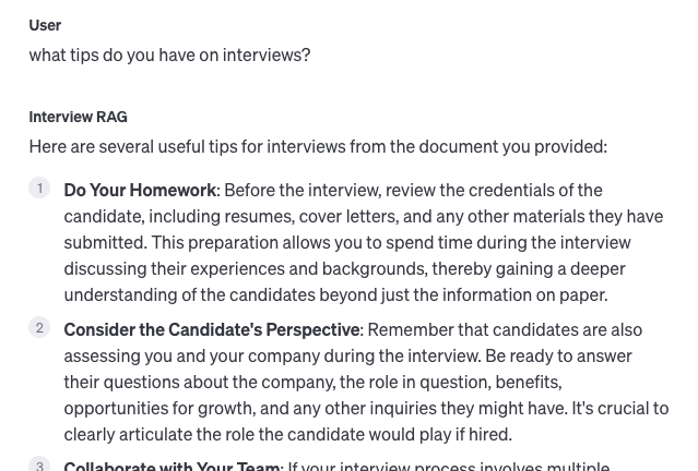 For this blog post, we conducted a small experiment using OpenAI’s assistants, which feature built-in RAG capabilities. We uploaded two documents into the RAG’s database: one was a manager’s guide to interviewing candidates, and the other, a guide for employees or students preparing for interviews. These documents present a unique challenge because they cover the same topic but cater to different audiences.