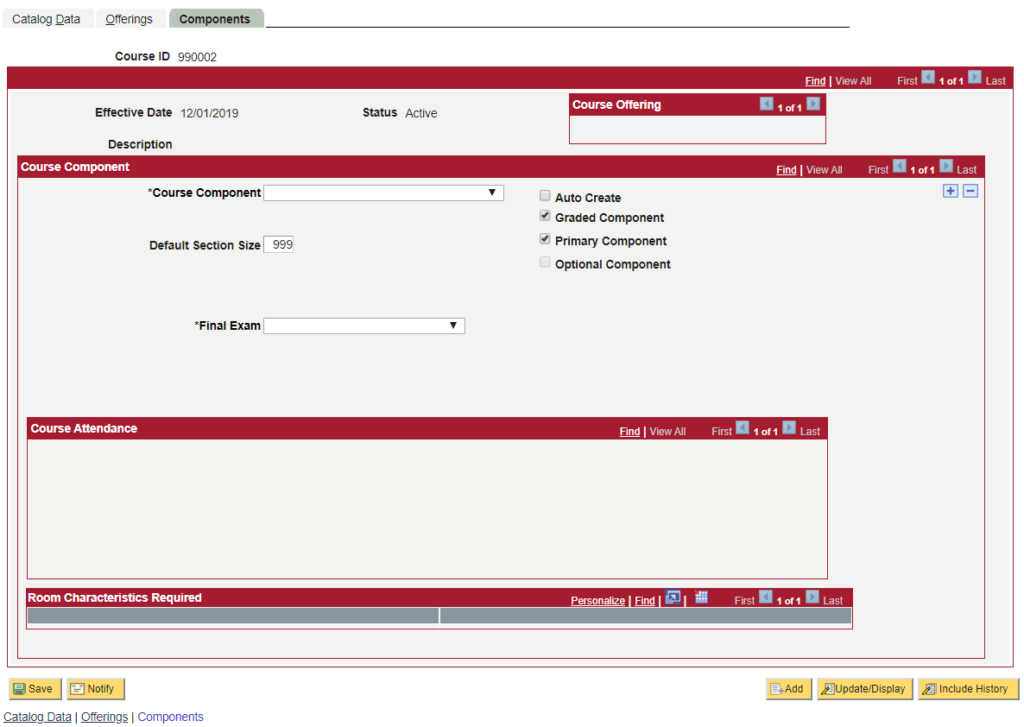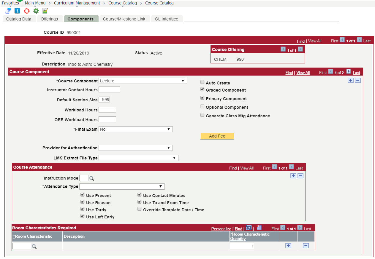 - Hidden the following fields: Instructor Contact Hours, Workload Hours, OEE Workload, Generate Class Mtg Attendance, Provider for Authentication, LMS Extract File Type, Add Fee button, all Course Attendance fields, All Room Characteristics fields